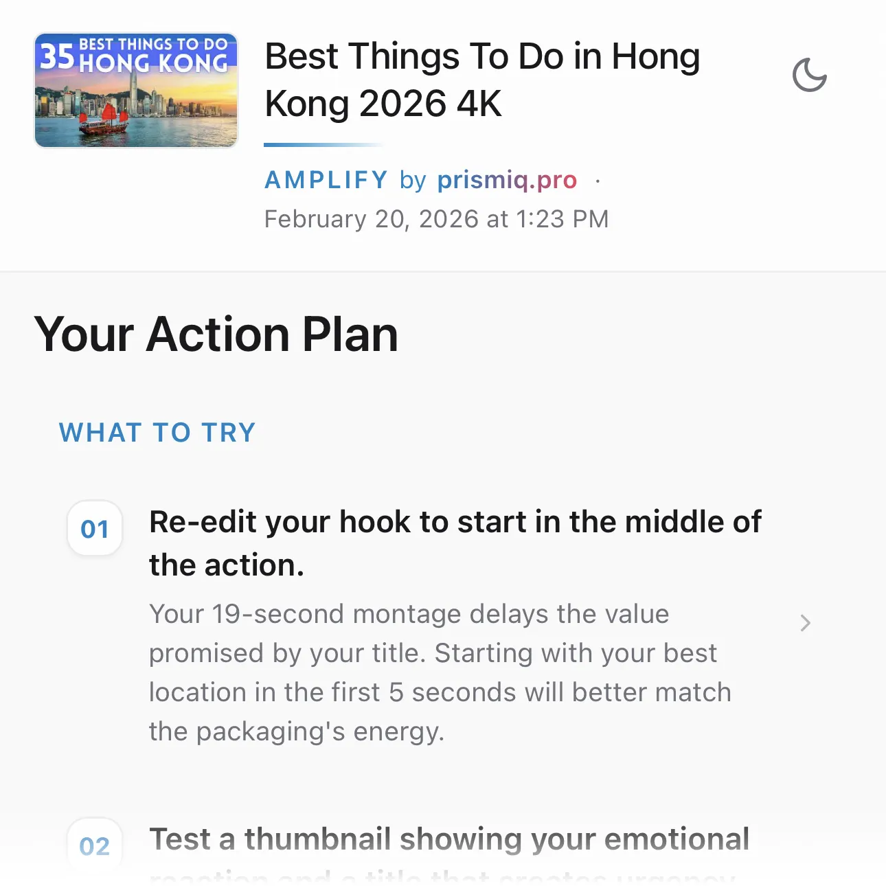 Get a personalized Amplify Plan with fixes specific to your video. Better hooks. Higher CTR. Longer AVD. The fixes that pay off.